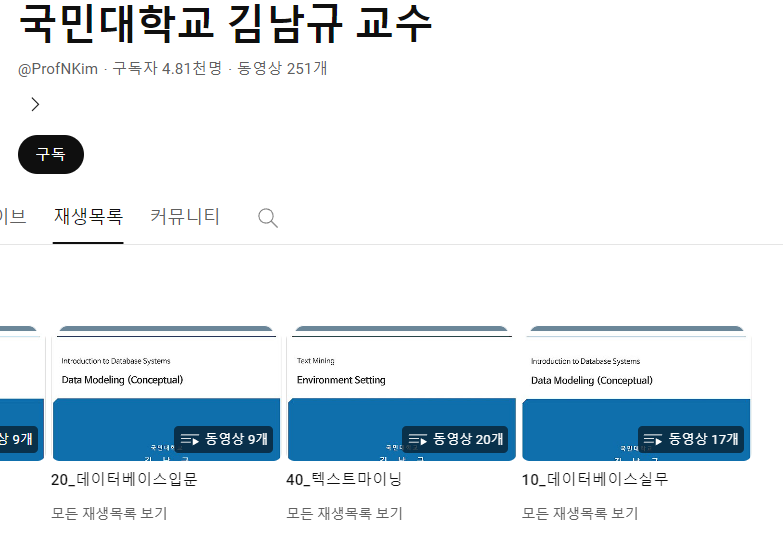 이 강의는 돈이 드는 것도 아닌 유튜브에서 무료로 볼 수가 있는데요, 바로 국민대 김남규 교수님의 데이터베이스 실무 강의입니다! (링크 https://www.youtube.com/@ProfNKim/playlists)