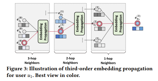 더 많은 mbedding propagation layers을 쌓음으로써 high-order connectivity information을 이용할 수 있습니다. high-order connectivities은 유저와 아이템 사이의 관련성을 나타내는 score을 추정하기 위한 collaborative signal을 인코딩하는데에 중요하게 작용합니다. 층을 쌓음으로써 유저(아이템)는, 만약 층수가 3일때 3-hop 이웃으로부터 전파된 메세지를 활용할 수 있습니다.