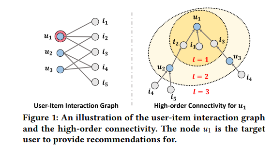 위 Figure 1은 high-order connectivity의 개념을 소개하고 있습니다. 유저1의 관점에서 설명을 드리자면 우선 왼쪽은 user-item interaction graph구조를 나타내고 있습니다. 유저1인 u1와 연결된 아이템을 보면 i1, i2, i3이고 이는 과거에 유저1이 아이템1,2,3을 클릭하거나 구매한 interaction을 나타냅니다. 오른쪽 그림은 u1의 high-order connectivity를 보여줍니다. 먼저 i(1,2,3)은 u1과 상호작용이 있는 아이템이고, i_2가 유저2와 상호작용하므로 이를 경로로 나타내면 u1 ← i2 ← u2 입니다. 이때 u1에 대한 i2의 경로 길이는 1이고 u2의 경로 길이는 2입니다. 이 경로는 u1과 u2사이에 행동 유사성이 있는 것을 나타냅니다. 더 긴 경로인 u1 ← i2 ← u2 ← i4을 보시면 u2가 i4와 상호작용한 데이터가 있기 때문에, u1도 i4을 구매하거나 클릭할 가능성이 높다고 유추할 수 있습니다. 그리고 l=3 에서 i4가 i5보다 u1이 더 흥미를 가질 아이템이라고 유추할 수 있는데, 이는 l=3에 i4가 두개있는 반면 i5는 한개가 있기 때문입니다.