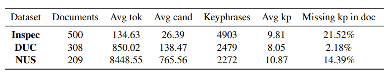 Avg cand: 후보단어의 평균 토큰 수 Avg kp: 문서당 평균 keyphrases(label, golden key) 수