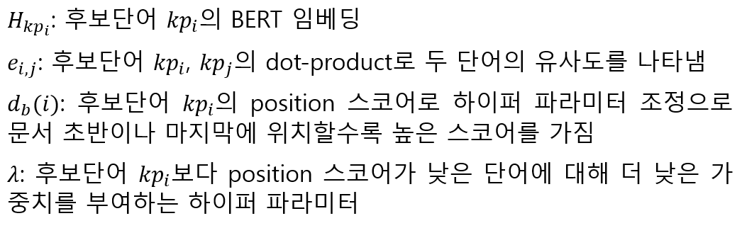 이를 보이기 위해 기존 단계는 EmbedRank와 동일하지만(문서-단어 유사도) 각 후보단어의 local 중요성을 계산하기위해 Centrality 계산을 추가로 진행하였습니다. 계산 과정은 다음과 같습니다.