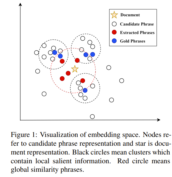 저자는 위 그림과 같이 골든 키워드(label)가 기존 EmbedRank가 뽑아낸 문서와의 유사도가 높은 단어들의 일부에 더해서 local-topic을 형성하는 단어들 중 중요한 단어도 골든 키워드라고 주장했습니다.(이에 대한 타당한 근거(실험)가 없어 아쉬움)